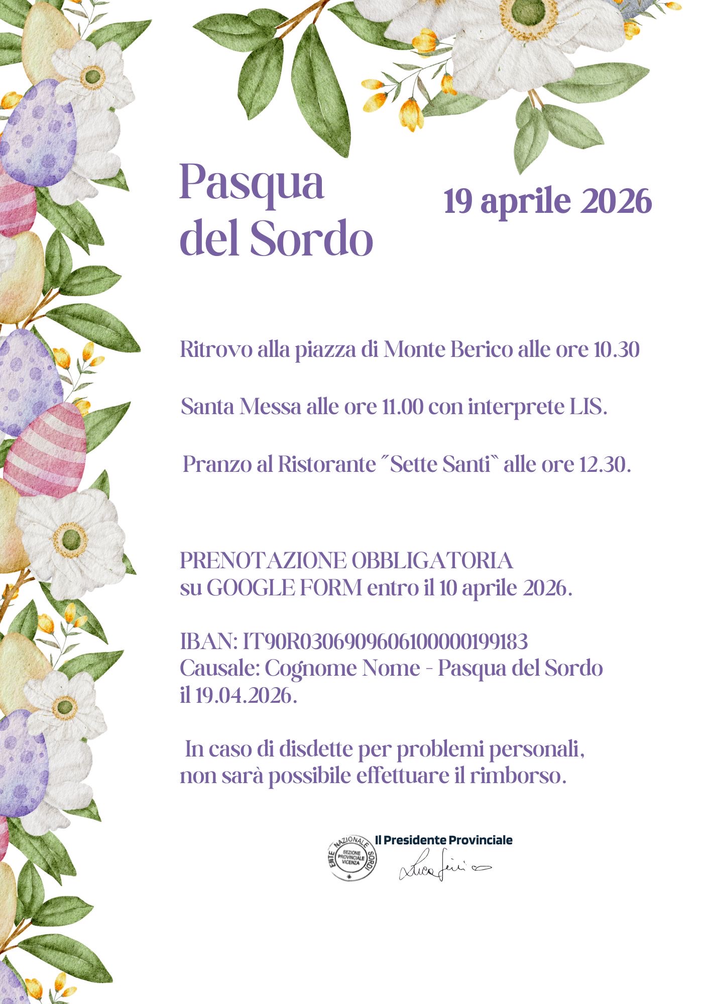 Siamo lieti di comunicare di organizzare la ricorrenza Pasqua del Sordo. È un’occasione speciale per unire tradizione, inclusione e condivisione.